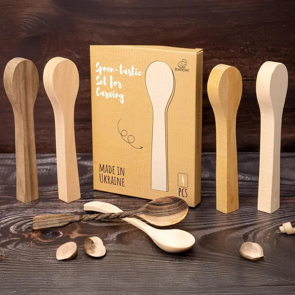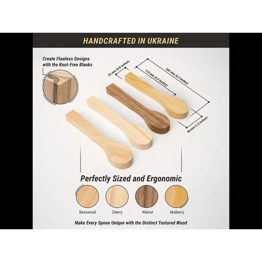Monipuolinen aihiosarja, joka sisältää neljä erilaista puulajia lusikan kaivertamiseen: lehmus, kirsikka, mulperi ja eurooppalainen saksanpähkinä.