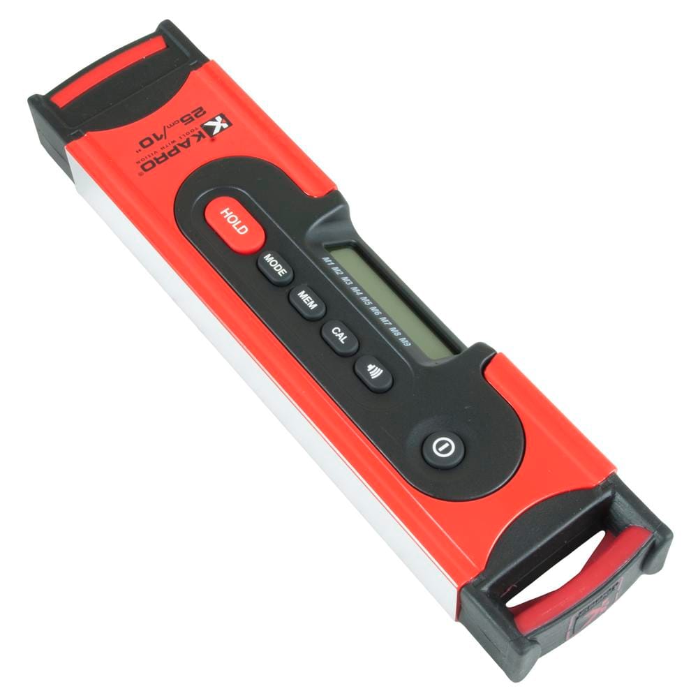 Selkeälukuisesta taustavalaistusta digitaalisesta näytöstä voit helposti lukea mitattuja kulmia. Näytön lukema kääntyy myös ylösalaisin vesivaakaa käännättäessä. Vesivaaka voidaan myös asettaa antamaan äänimerkin, mikä mahdollistaa sen käyttämisen ilman digitaaliseen näyttöön katsomista! Suuren kädensijan ansiosta vaaka on helppo asettaa ja pitää erilaisilla pinnoilla.