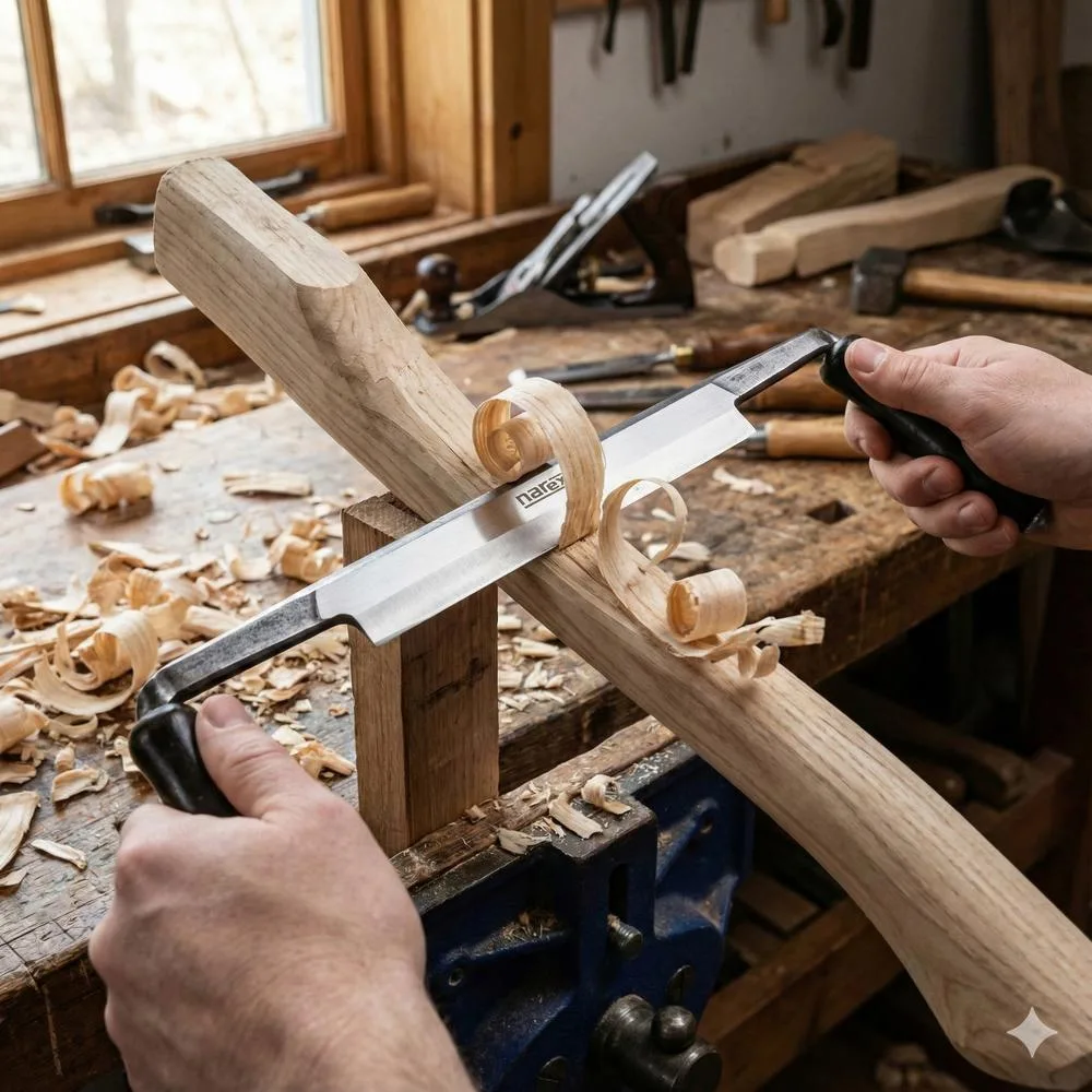 - Perinteinen muotoilu: Työkalun klassinen kaksikahvainen rakenne mahdollistaa suuren voimantuoton ja tarkan hallinnan vetoliikkeellä, mikä on ominaista perinteiselle puuntyöstölle.