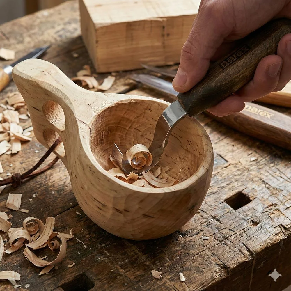 - Kuksat ja kupit: Soveltuu erinomaisesti perinteisten puukuppien (kuksa) sisäpuolen kovertamiseen.