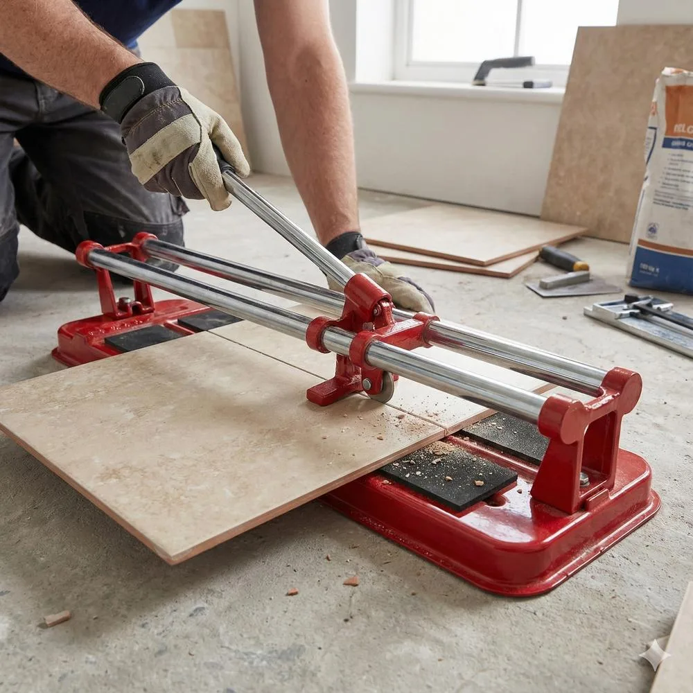 Huolto: Puhdista leikkuri säännöllisesti laattapölystä ja sirpaleista. Tarkista terän kunto säännöllisesti. Jos viilto muuttuu epätasaiseksi tai laatta ei katkea siististi, terä on todennäköisesti kulunut ja se tulee vaihtaa. Voitele ohjainkiskot tarvittaessa kevyellä koneöljyllä sujuvan liikkeen varmistamiseksi.