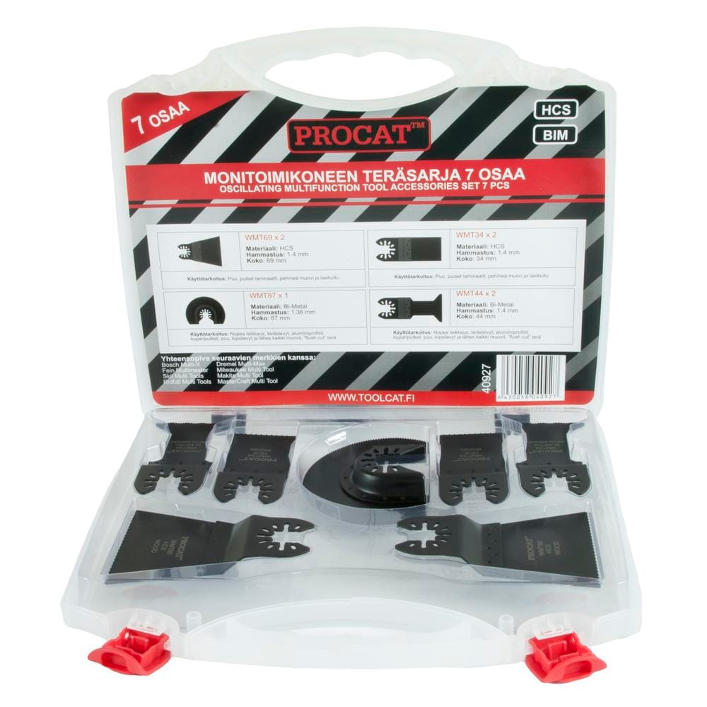 Teräsarja monitoimikoneille seitsemällä eri terällä. Pakkaus sisältä teriä puulle, metallille, alumiinille ja erilaisille muoveille.
