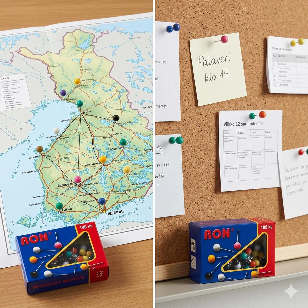Ron Karttaneula 100 kpl värilajitelma pyöreä pää on monikäyttöinen työkalu visuaaliseen merkitsemiseen. 100 kappaleen värilajitelma pyöreäpäisiä karttaneuloja soveltuu erinomaisesti pisteiden ja reittien korostamiseen kartoilla sekä tiedotteiden kiinnittämiseen korkki- ja tekstiilitauluille. Eri värien ansiosta voit luoda selkeitä ja helposti hahmotettavia merkintöjä, jotka parantavat organisaatiota ja viestintää.