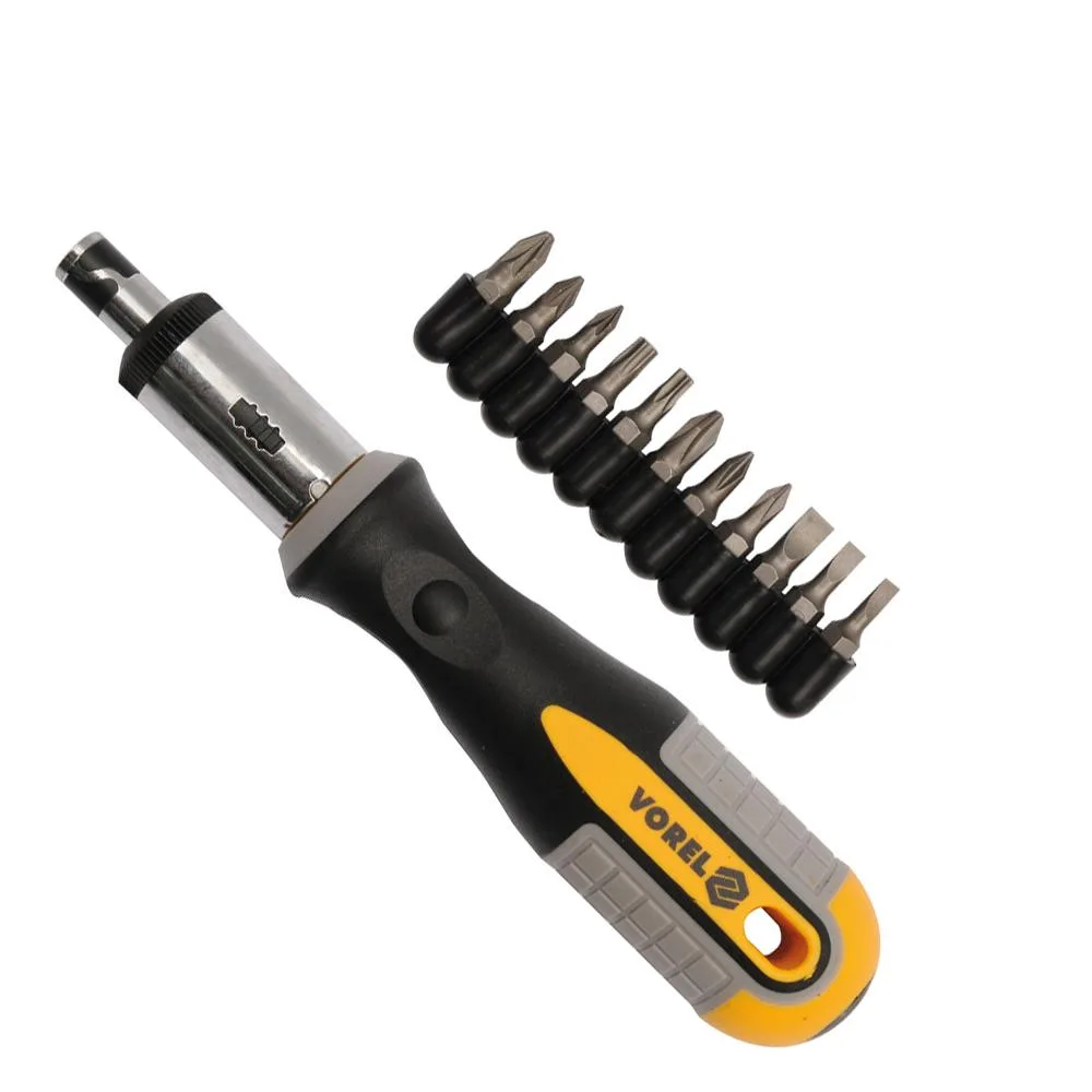 Vorel 12-osainen räikkäruuvimeisselisarja on kattava valikoima erilaisia ruuvauskärkiä yhdistettynä kätevään räikkämekanismilla varustettuun ruuvimeisseliin. Tämä sarja on suunniteltu monipuolisiin ruuvaustöihin. Sarja sisältää yleisimmät ruuvikärjentyypit: uraruuvit (flat), Phillips-ruuvit (PH), Pozidriv-ruuvit (PZ) sekä Torx-ruuvit, mikä mahdollistaa erilaisten ruuvien avaamisen ja kiinnittämisen.